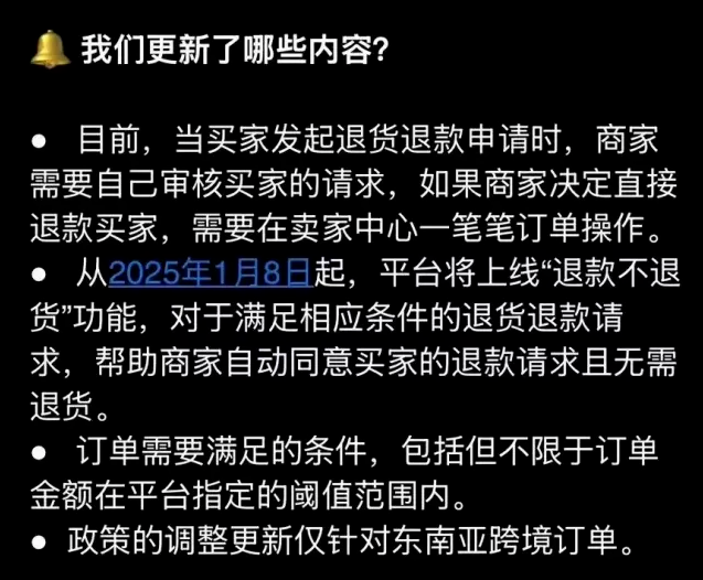 近日,TikTok Shop官方宣布,自2024年1月8日开始,东南亚跨境订单将上线“退款不退货”功能。“退款不退货”规...